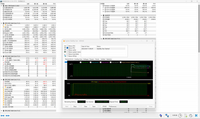 那么 Redmi G Pro 的这套散热系统性能释放究竟如何呢?我们接下来就使用 AIDA64 进行单烤 FPU,15 分钟后,CPU 温度稳定在了 85℃,此时 CPU 功耗达到了 80W 左右,这个性能释放还是很不错的,能释放 i7-12650H 的大部分性能。