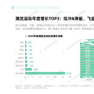 根据惊蛰研究所最新发布的《2023潮流运动消费趋势洞察报告》显示,在2022年,飞盘以8.54倍的网络热度增长屈居第二,而陆冲&滑板的网络热度增长了52.44倍,成为全年热度增长最高的潮流运动。在城市街头,越来越多的年轻人正在加入陆冲&滑板爱好者的阵营,在广场和空地感受“贴地飞行”的畅快体验。