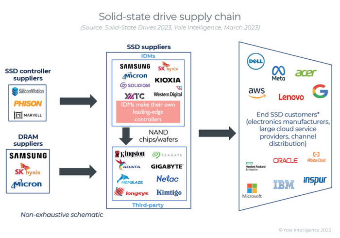 三星、铠侠、西部数据、美光、SK海力士和Solidigm等原厂制造商依旧占据市场主流,市场份额达到了82%,而第三方SSD制造商的规模相比之下要小得多,比如金士顿、威刚和希捷等,占据18%的市场份额。