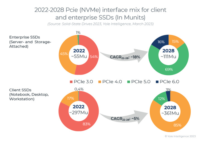Yole Group预计2028年将有69%的企业SSD使用PCIe 5.0接口,而使用PCIe 6.0接口的SSD占比为16%。如果是客户端SSD,2028年PCIe 6.0 SSD仅占微不足道的3%。2022年SSD的市场规模从2021年的340亿美元降至290亿美元,Yole Group认为这种急剧下滑是偶发事件,并不代表市场已经发生根本性变化。由于市场存在较多不确定因素,Yole Group没有对2023年市场的整体前景、数量和金额作出预测,不过认为客户端SSD未来几年的需求都相对疲软,而企业SSD会受到数据中心领域需求的推动而持续增长。