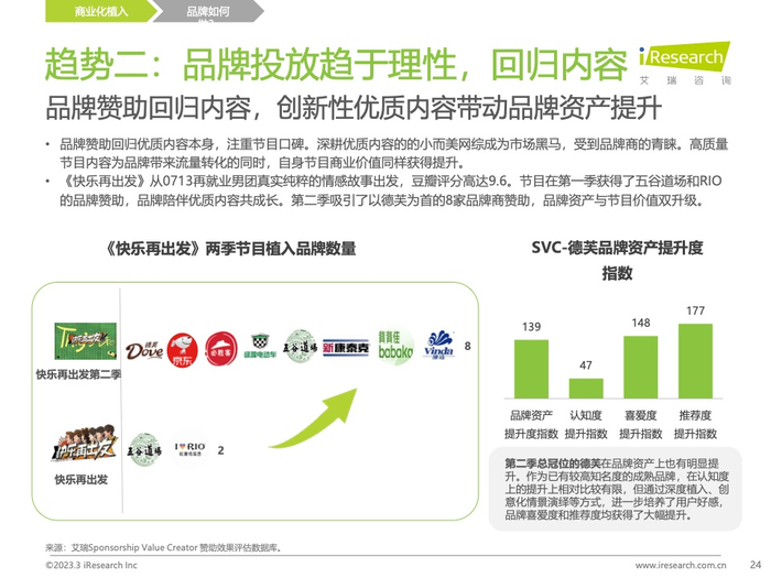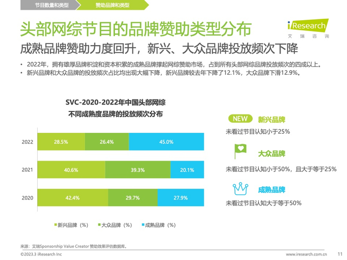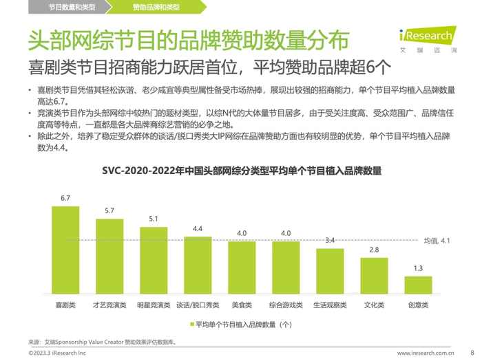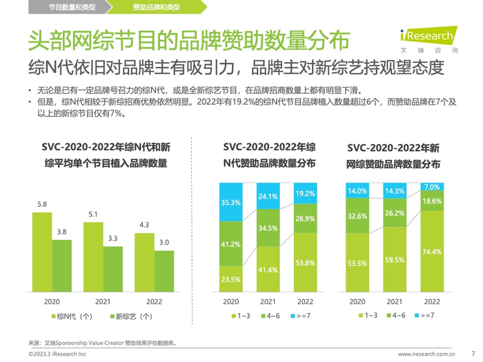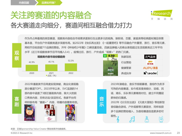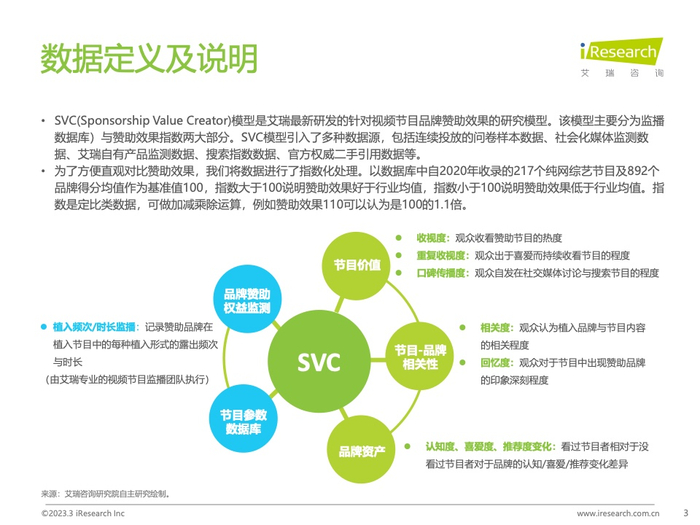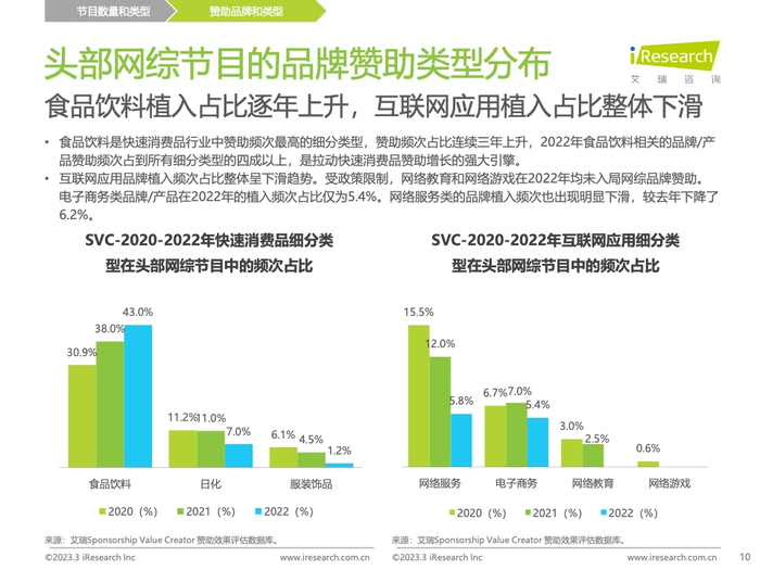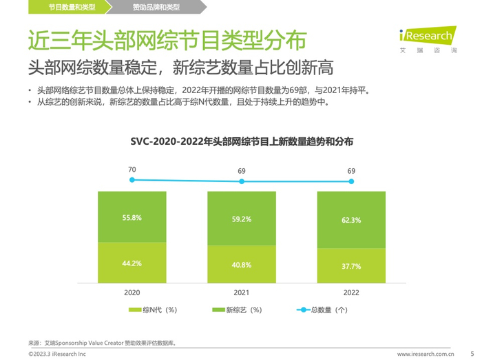 本报告基于艾瑞SVC(Sponsorship Value Creator)赞助效果评估数据库,探究近三年中国网络综艺及品牌赞助的趋势变化,从头部网综节目类型分布、品牌赞助数量及类型、赞助形式和效果等角度深入分析,对2022年-2023年网络综艺商业变现趋势进行复盘总结和展望。