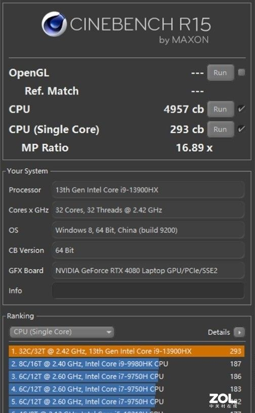 参考CINEBENCH测试标准,CINEBENCH R15多核4957cb、单核293cb。