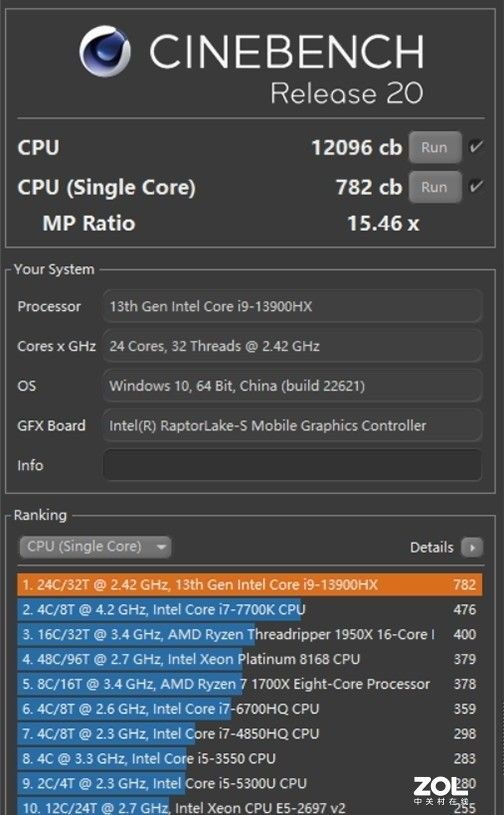 CINEBENCH R20多核12096cb、单核782cb。