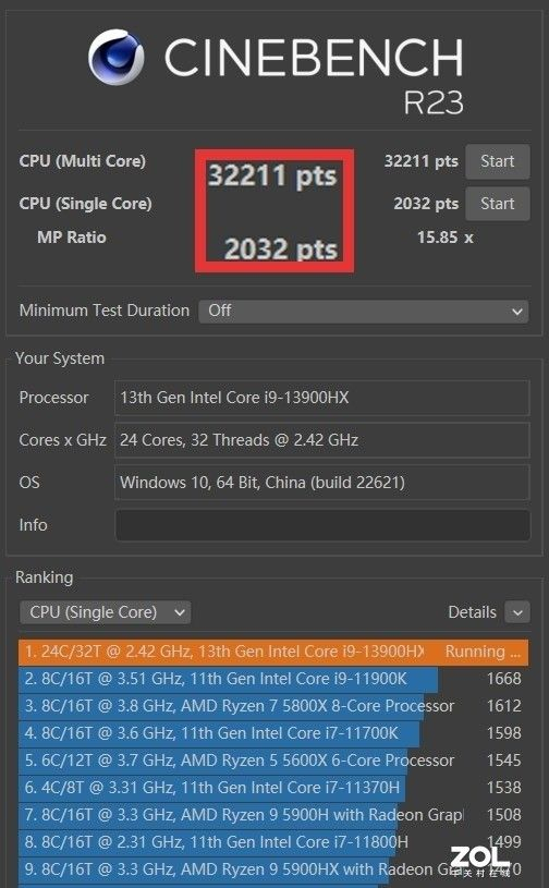 CINEBENCH R23多核32211pts、单核2032pts。