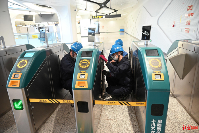站在站厅层内可以看到,此时已经没有乘客,按照正常的流程,每日零点12分,锦城广场东站迎来最后一班车,待乘客出站后,工作人员开始对检票口的安检设备、测温设备等进行关闭,随后进行关站。