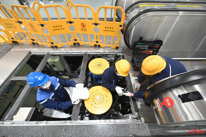 扶梯、空调、屏蔽门……车站内的各个区间,都有工作人员紧张忙碌着,他们共同为保障第二天车站的安全、正常运行而努力着。