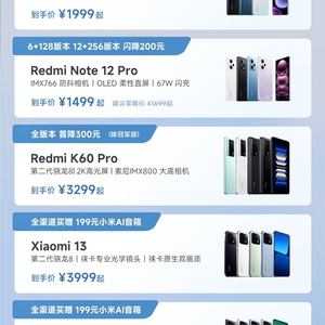 其中,小米方面,小米13全渠道购买赠送199元小米AI音箱,到手价3999元起;