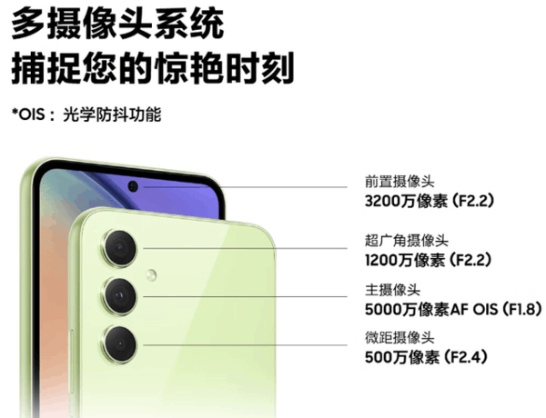 三星GalaxyA54上架发售(图源来自网络)影像上,三星Galaxy A54搭载多摄像头系统,前置3200万像素摄像头,后置镜头组由5000万像素AF OIS主摄像头、1200万像素超广角摄像头、500万像素微距摄像头组成,硬件实力不俗。三星Galaxy A54凭借VDIS、大角度OIS光学防抖技术、自动构图和自动对焦更轻松拍摄高质量且画面稳定的视频,同时由于大尺寸图像传感器和全像素对焦技术,可通过AI技术提供重录照片功能,还能使用对象橡皮擦去除不需要的阴影和反射等,为消费者提供更多拍照辅助功能。