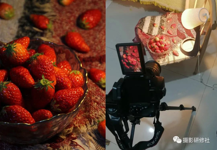 主体就是这一碗草莓,也是我们想要拍摄的东西。陪体就是周围散落的草莓,是与主体搭配共同出镜的元素。背景就是桌面,是拍摄的环境,是主体陪体以外还能看到的元素。