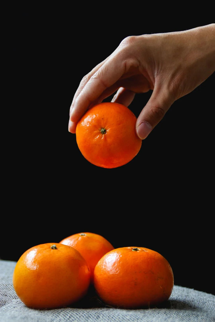 首先要确保背景是简洁的,最常见的就是纯色背景,我通常也会建议学员先拿纯色背景练手。拍摄下面这张照片时,我把橘子放在了沙发边上,这样就能取沙发的线条(见下 2 段法则)。同时又把我的黑色短袖放在后面当背景。