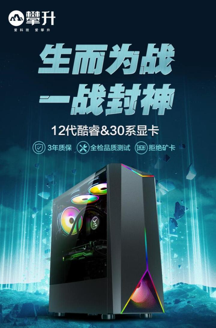 率先登场的是攀升在2023年上线的战神系列主机,这款主机采用了当下最流行的大侧透设计,搭配上LED灯带和炫彩风扇,颜值相当出挑。配置上,该机采用了i5 12400F处理器、GTX 1650 4G显卡、H610M-ATX主板、16G DDR4 3200MHz内存、512G NVMe SSD、四铜管塔式散热器、400W电源,并且同样提供三年上门服务和有限保修。