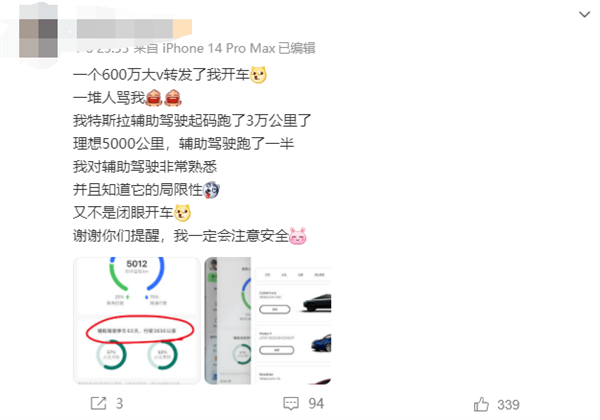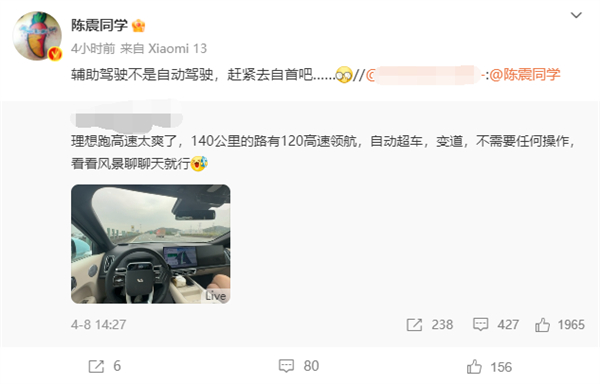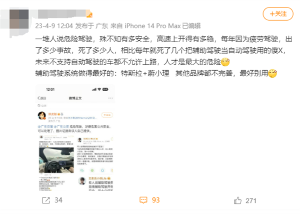 这条博文发布后,引起了网友的强烈不满,一些知名汽车博主也注意到了该事件,@陈震同学在转发时表示“辅助驾驶不是自动驾驶,赶紧去自首吧”;而另一名知名大V韩路也点评为“ 辅助驾驶欺骗环,送命设备”。