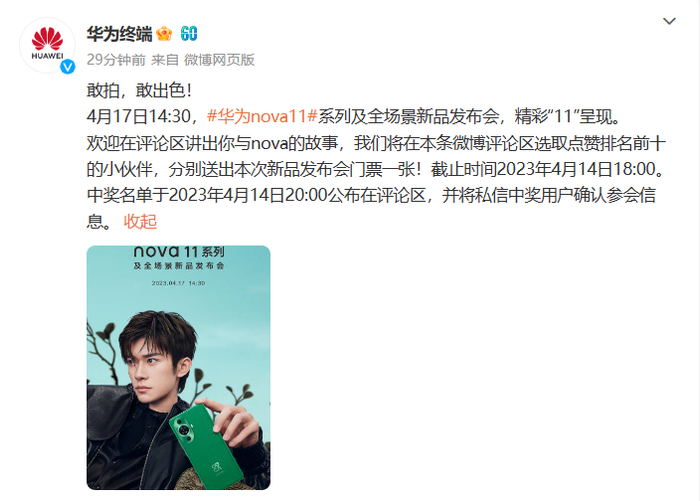 华为nova 11系列要来啦!今天上午,华为官方发布了新品发布会的预热海报,官宣“nova 11系列及全场景新品发布会”将于2023年4月17日14:30举办。华为nova系列作为华为旗下面向年轻消费群体推出的产品,此前一直凭借着在外观与影像等方面的出色表现,受到了众多消费者的青睐。距离上一代华为nova 10系列产品的上市已有一段时间,这次的发布更是吊足了大家的胃口。