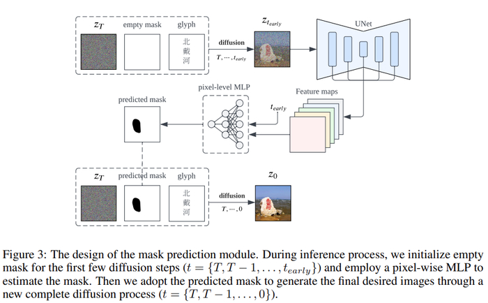 此外,通过使用特定领域的融合模块,条件 C 配备了混合字形和文本特征。文本掩码和字形信息的引入,让整个训练过程实现了细粒度的扩散控制,是提高模型性能的关键组成部分,最终得以生成带有汉字文本的图像。