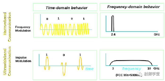 下图给出了 FM 调制和脉冲调制的对比,正是这个脉冲调制使得 UWB 信号能够工作在一个较宽的频带内。其实在早期,UWB 技术的名字就叫作脉冲无线电 Impulse Radio,1989 年才拥有了现在的名字。