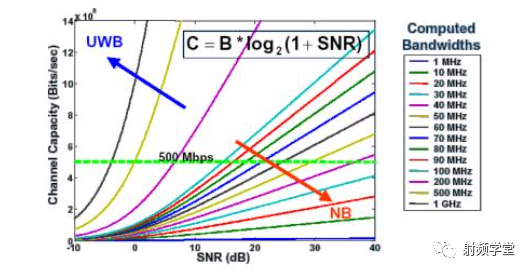 同样的,根据香农定理的公式,我们可以得到 UWB 的第二个好处,在一定的信道容量下,超宽带 UWB 可以接受比较差的信噪比 SNR。