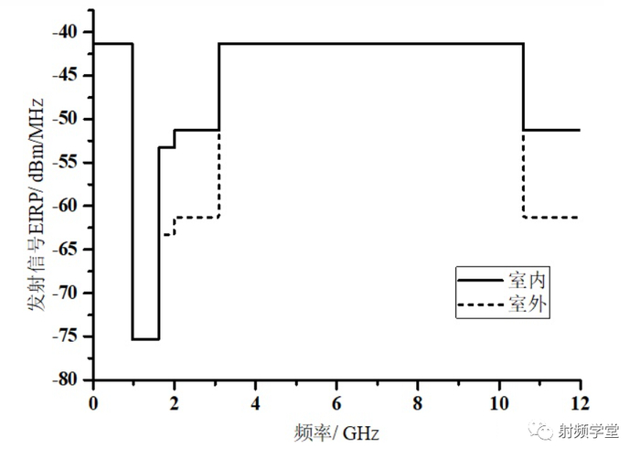 这么小的功率量级还有一个好处就是对其他通信系统的干扰也很小,所以可以和很多大功率通信技术共存,比如现在的 5G NR 在 3.5GHz 左右有多个比较重要的频段,还有 wifi 的 5.8GHz。当然安全起见,FCC 也规定了全频谱的干扰功率等级,如下图所示,分为室内和室外,仅在低于 960MHz 和 3.1GHz 到 10.6GHz 的频率范围内要求低于-41.3dBm / MHz,其他频段有更严格的功率要求。