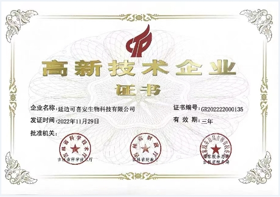 近来,延边可喜安生物科技有限公司(以下简称“可喜安生物科技”)收到了最新一期的国家高新技术企业证书,证书有效期从2022年至2024年。