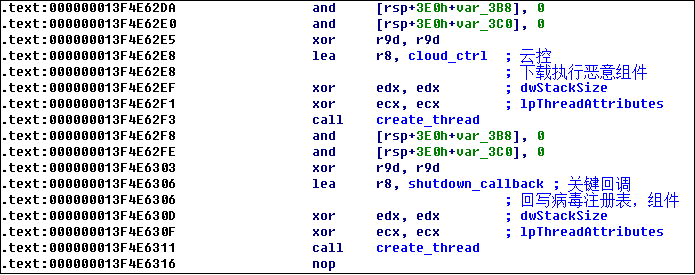 当携带木马的下载器被运行后,会将疯花木马的主控模块注入到svchost.exe进程中执行,主要包含两个病毒线程,一个通过云控加载劫持模块,另一个注册关机回调,回写病毒文件和注册表项: