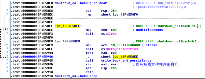 通过GetSystemMetrics实现应用层关机回调,并在关机回调时回写病毒文件和注册表: