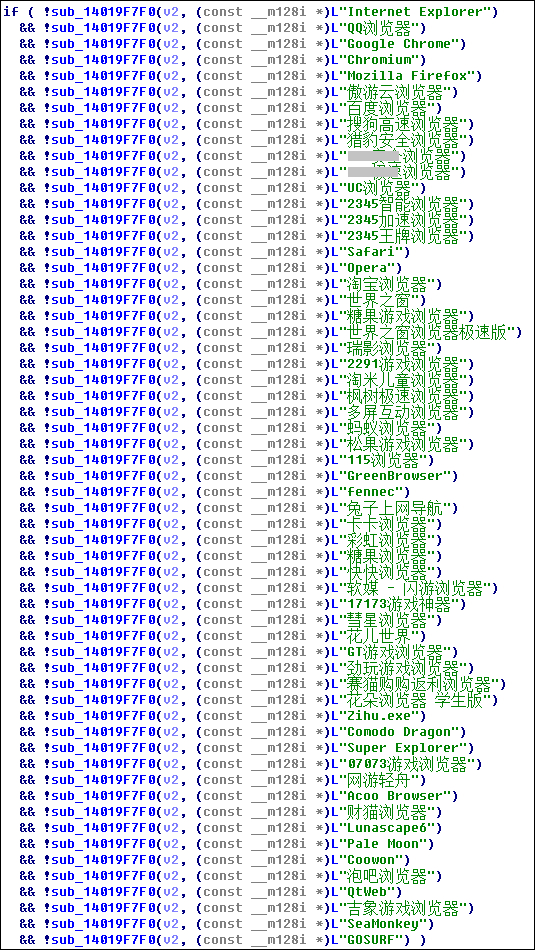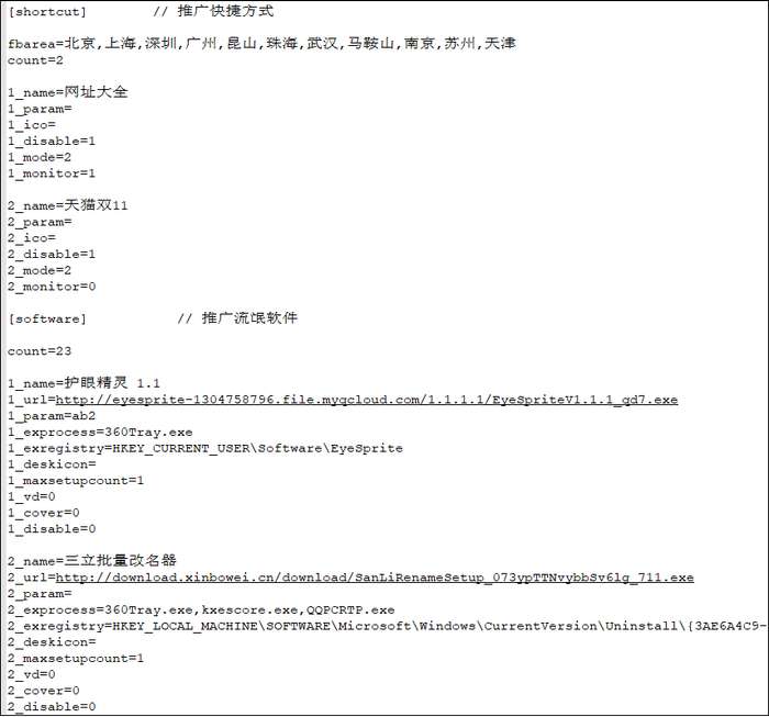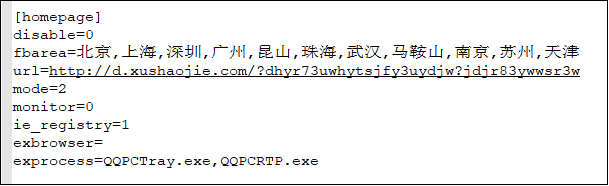 主控以同样的方式启动盈利模块,盈利模块包含篡改浏览器主页,推广软件,流氓快捷方式等进行牟利,配置文件中包含一些对于环境的判断条件,如fbarea字段存在,会检测北京,上海,广州,深圳等一线城市,并绕过。劫持浏览器主页的配置如下:
