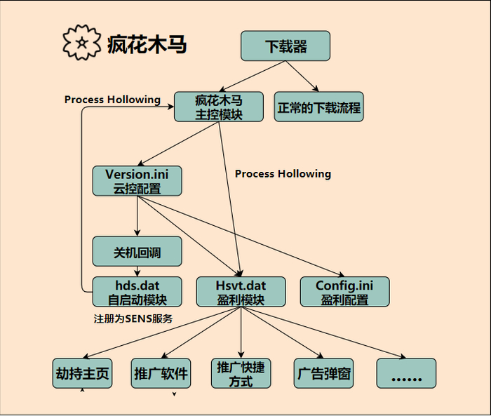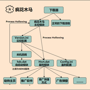 该木马是典型的云控木马,所有模块均以云端控制,内存加载的方式执行,通过Process Hollowing的注入方式绕过安全软件检测。通过GetSystemMetrics()实现了一个应用层的关机回调,并在关机回调中回写木马文件和注册表,绕过部分杀软的主动防御功能。疯花木马整体病毒流程如下图: