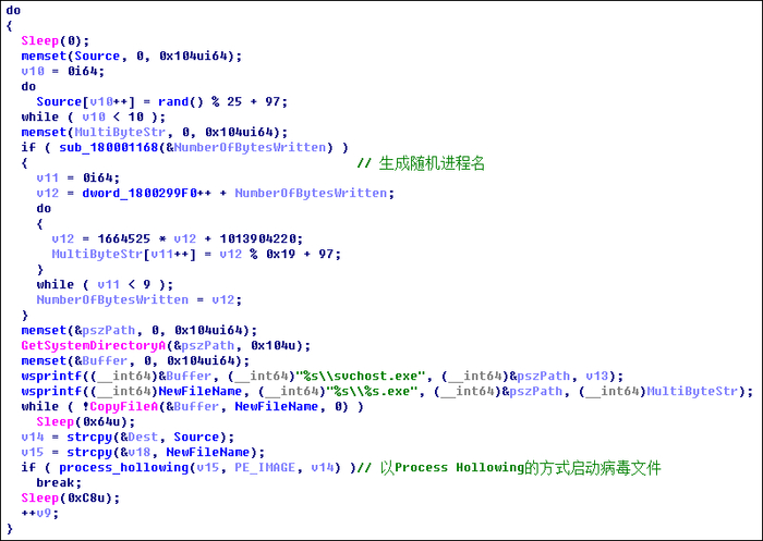 自启动模块会检查进程名跟命令行是否为sens服务,若不是则不会执行病毒逻辑,反之则会通过进程hollowing的方式启动主控模块: