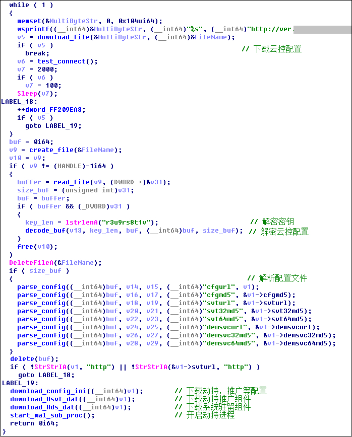 通过云控下载执行相应的恶意组件,云控的配置跟下载的组件均经过加密存储,下图是下载云控配置并进行解析的代码片段: