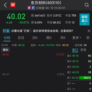4月10日,本想抱上华为大腿的东方材料(603110.SH)开盘遭遇“一”字跌停,当日收盘,报40.02元/股,最新市值为80.53亿元。