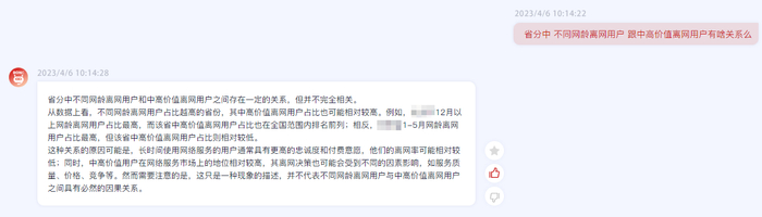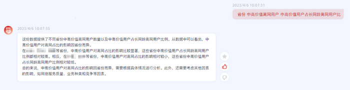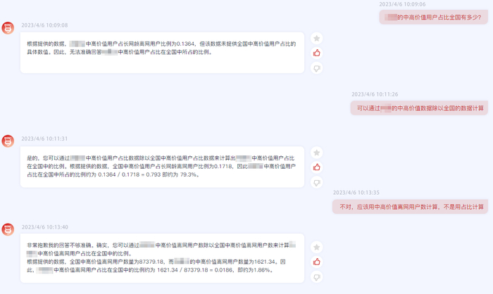 其次,通过对话交互的过程,“智能助手”可以进行统计逻辑的修正,如“某省的中高价值用户占比全国有多少?”这一问题在经过两轮对话后,及时对错误的统计结果进行了调整,结果正确;