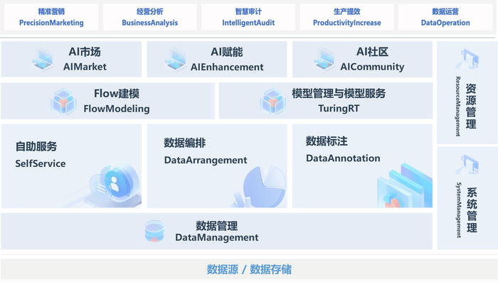 东方国信在大数据和人工智能领域已经深耕20余年,自主研发了功能完备的人工智能产品体系。基于SPSS技术和东方国信多年的数据、模型和算法创新积累,创造性的打造了一个集数据统计分析、特征工程等多种算法类型于一体的人工智能开发与服务平台——图灵引擎,如图所示,实现了从数据分析、可视化到AI模型的开发、训练、部署直至推理的全流程一站式平台。基于图灵引擎和应用实践,东方国信在运营商、金融、政府和工业领域等积累了大量的领域知识和业务经验。
