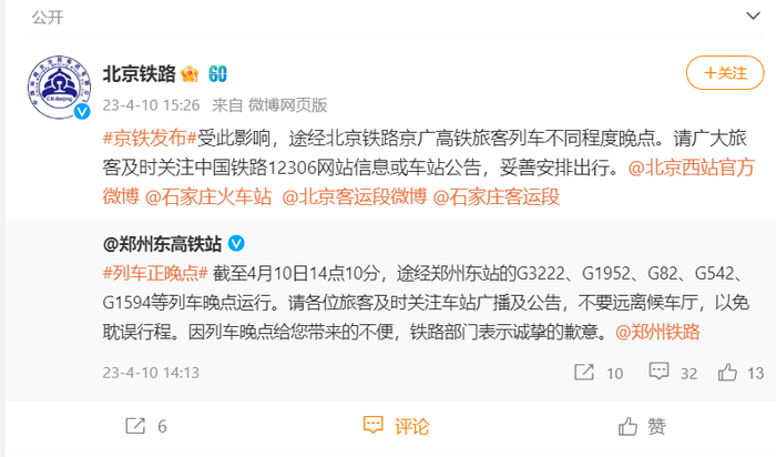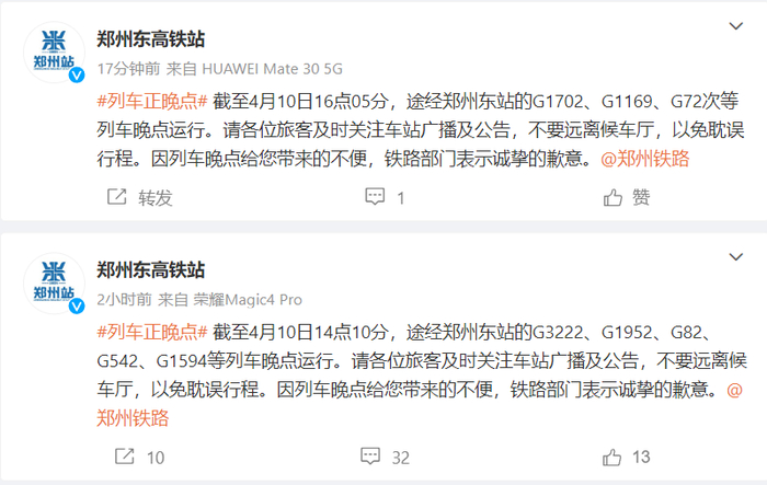 商丘火车站也发布消息,截至 4 月 10 日 15 时 10 分,途经徐兰高铁的 G1169、G316、G1312、G1478、G3135 次晚点运行。请各位旅客关注车站广播及公告,不要远离候车厅,需要办理改签、退票的旅客请到售票窗口办理。因列车晚点带来的不便,铁路部门表示歉意。