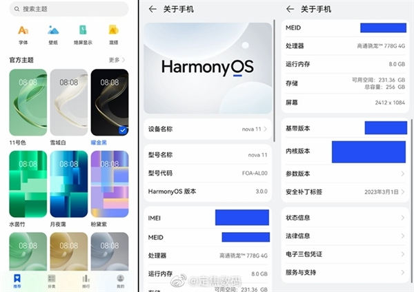 截图显示,华为nova 11出厂预装鸿蒙OS 3.0系统,搭载高通骁龙778G 4G,该芯片此前已在华为P50E、华为nova 9、华为nova 10、华为Pocket S等机型上多次使用。