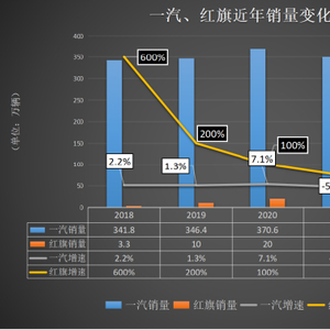 2018年,红旗全年总销量3.3万辆,相较于2017年的4702辆迅猛增长;2019年,红旗年销量再攀新高,突破10万辆大关,同比增长200%,比计划整整提前了一年;2020年,红旗品牌宣布2020年的累计销量已经突破20万辆,同比增长100%。