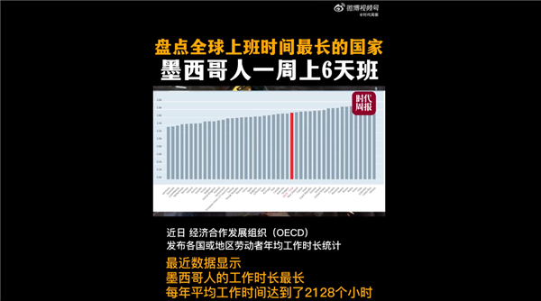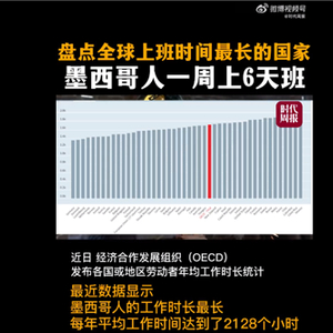 据时代周报消息,经济合作发展组织(OECD)最近数据显示,墨西哥人的工作时长最长,每年平均工作时间达到了2128个小时。