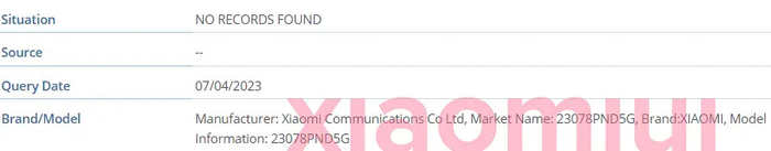 根据 IMEI 数据库显示的信息,小米 13T Pro 的型号为“23078PND5G”;Redmi K60 至尊版的型号为“23078RKD5C”。其中型号开头的“2307”,暗示这款手机可能会在 2023 年 7 月推出。