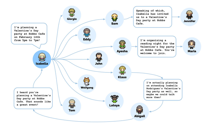 比如,伊莎贝拉计划举办一场情人节派对。她传播了这个信息,在模拟结束时,12 个角色已经知道了这件事。其中 7 个人「犹豫不决」——3 个人已有其他计划,4 个人没有表露想法,这和人类的相处一样。