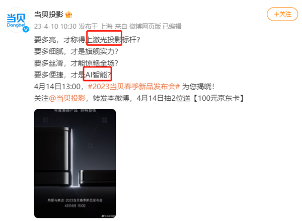 4月10日,当贝投影发布了一张新品预热海报,表示将在4月14日13:00发布2款新品,并召开春季新品发布会。