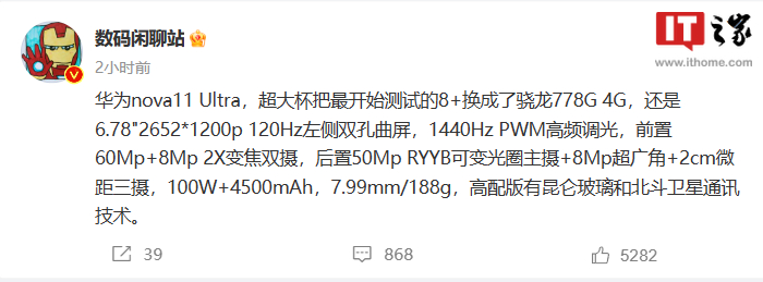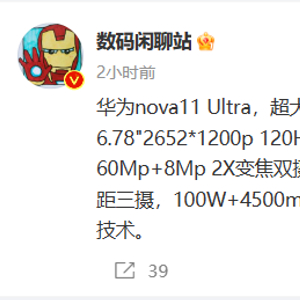 IT之家 4 月 11 日消息,华为将于 4 月 17 日 14:30 召开华为 nova11 系列及全场景新品发布会,今天 nova 11 Ultra 的关键配置已经曝光。