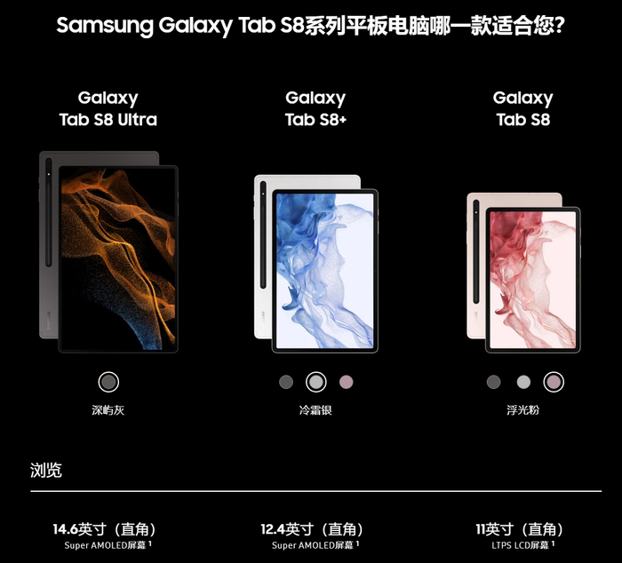 其中 Galaxy Tab S8 采用 LTPS LCD 屏幕,而 Galaxy Tab S8+ 和 Galaxy Tab S8 Ultra 采用 Super AMOLED 屏幕。