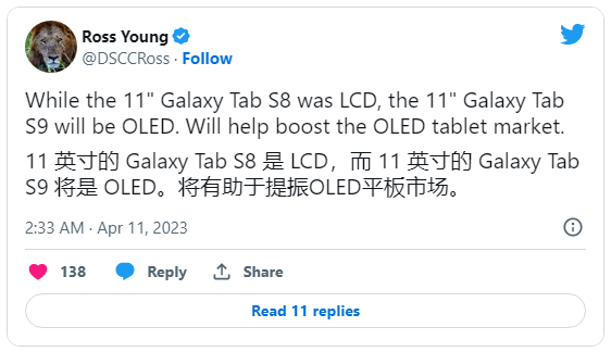 Ross Young 在最新推文中表示 11 英寸的 Galaxy Tab S9 同样会采用 OLED 面板,这有助于提振 OLED 平板市场。