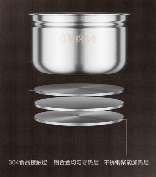 美的速嫩感电压力锅配备了一只精钢厚釜内胆和一只玄钢厚釜内胆,专胆专用可满足用户烹制花样食物的需要。其中精钢厚釜采用SUS304食品级材质,底部2.7mm三层复合,耐刮花并且受热更均匀,十分适合用来制作各种肉类或炖汤;玄钢厚釜内胆底部三层复合厚度3.9mm,更高的厚度带来更优良的传热性能,煮饭喷香Q弹不粘锅,使用过后非常方便清洗。