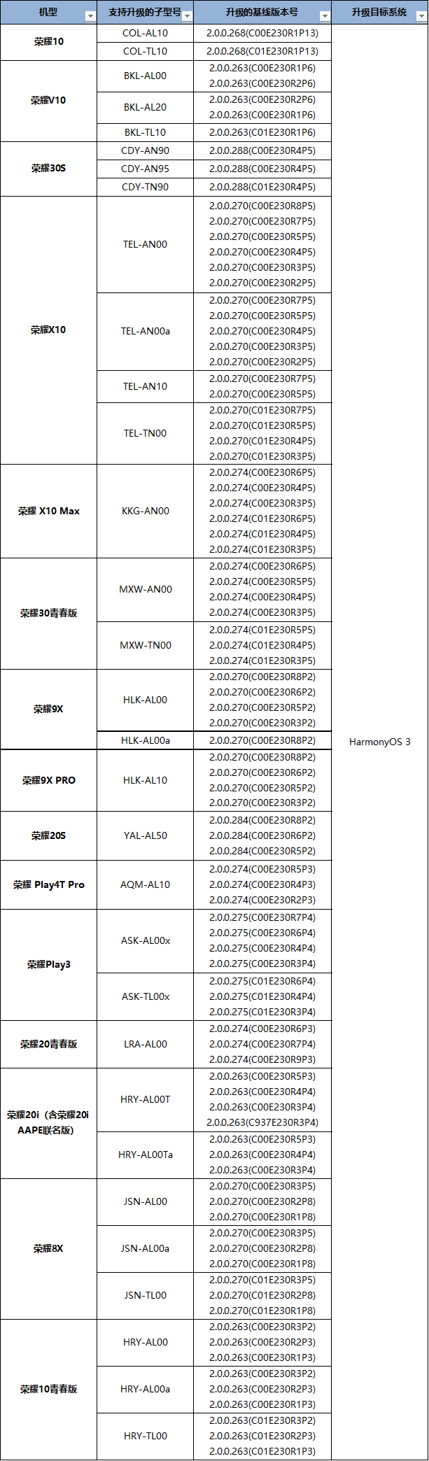 荣耀 10、荣耀 V10、荣耀 30S、荣耀 X10、荣耀 X10 Max、荣耀 30 青春版、荣耀 9X、荣耀 9X PRO、荣耀 20S、荣耀 Play4T Pro、荣耀 Play3、荣耀 20 青春版、荣耀 20i(含荣耀 20i AAPE 联名版)、荣耀 8X、荣耀 10 青春版。