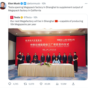“特斯拉在上海开设Megapack工厂以补充加州Megapack工厂的产量。”马斯克通过推特转发相关动态并表示。