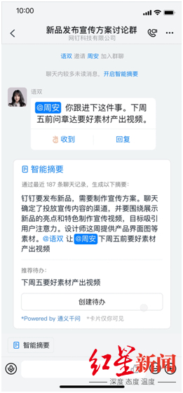 而钉钉接入“通义千问”测试之后,可以自动生成工作方案,也可以在会议纪要后自动生成总结和待办事项。比如当被拉入一个新群聊,钉钉可基于群内此前的聊天内容,自动生成聊天摘要,帮助用户快速了解上下文,再也不用手动爬楼,群聊聊到共识动作,还能自动生成待办。