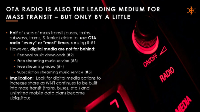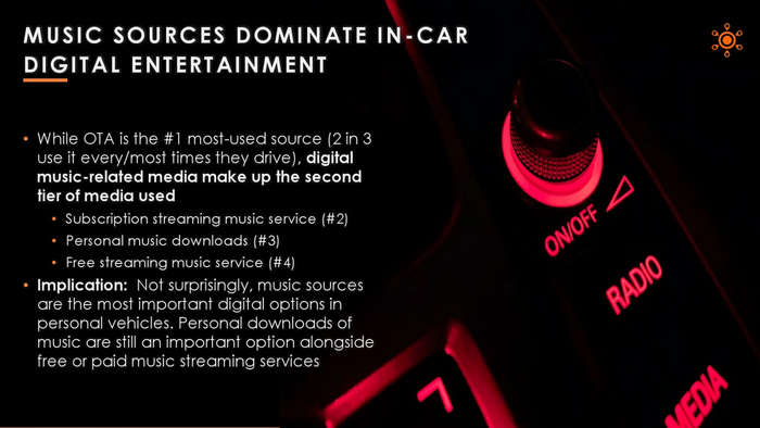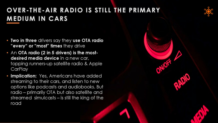 AM/FM 广播长期以来一直是车载音频的首要来源。在接受 Hub Entertainment Research 调查的美国人中有近63%表示每次或大部分时间在驾车时都使用 OTA 收音机。研究发现这超过了其他选项,包括流媒体和个人下载。