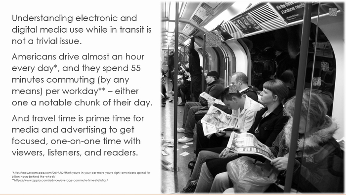 OTA 广播在受访者使用公共交通工具时也处于领先地位,但在这种情况下,偏好分布要均匀得多。一半的人表示他们在使用公共交通工具的所有时间或大部分时间都在收听 OTA 广播,几乎相同比例的人报告说他们收听或收看个人音乐下载(48%)、免费流媒体音乐/音频(47%)、免费流媒体视频(47 %),以及流媒体音乐/音频订阅(45%)。