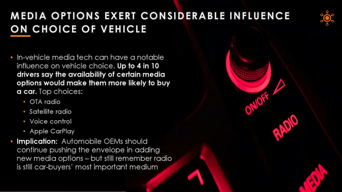 这种偏好延伸到汽车购买:近39%的受访者表示,如果汽车配备 OTA 收音机,他们更有可能购买;卫星广播(31%)和Apple CarPlay(27%)的影响力更小。