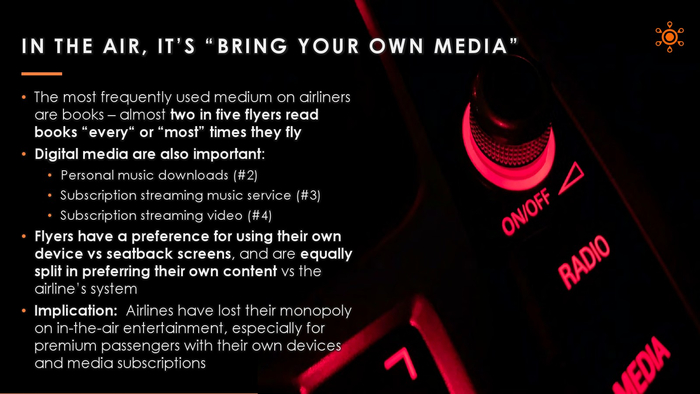 空中旅行是另一个故事:在飞机上,书籍是最常用的媒介,37% 的人每次或大部分时间都会看书。个人音乐下载是第二大常用媒介 (33%)。