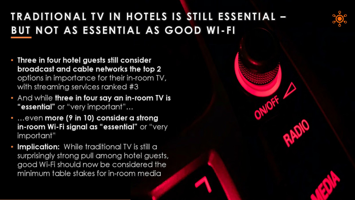 最后,在检查移动中的媒体使用(家庭、办公室等以外)时,Wi-Fi 被认为是酒店客房中最重要的服务,而广播和有线网络排在第二位。